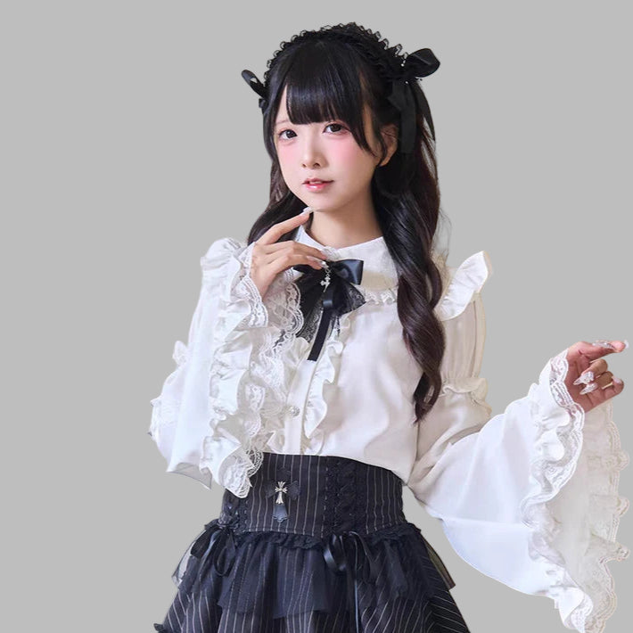 Bílá gotická halenka s černou krajkou a mašlí Jirai Kei Lolita