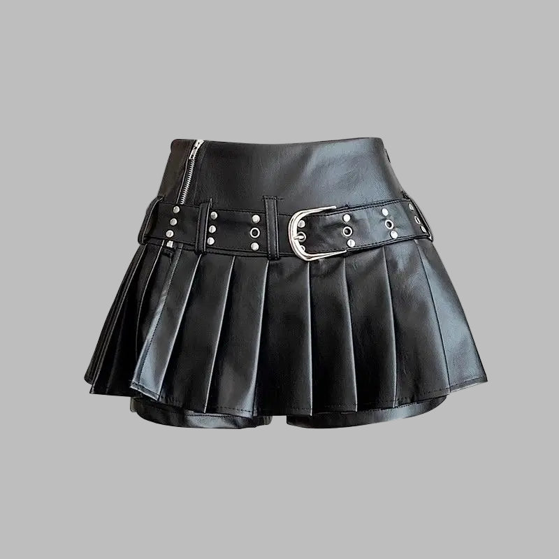 Černá kožená plisovaná mini sukně s kovovým páskem