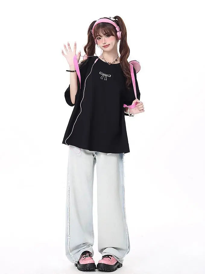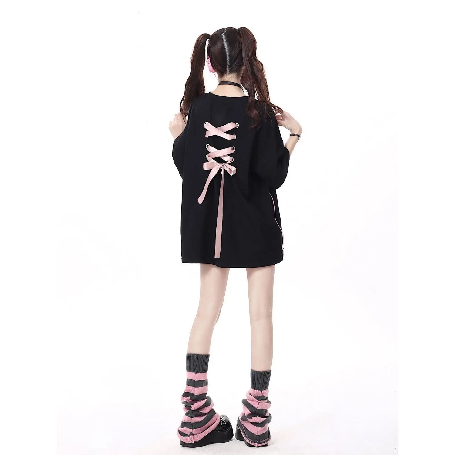 Černá mikina Jirai Kei se šněrováním na zádech a růžovou stuhou