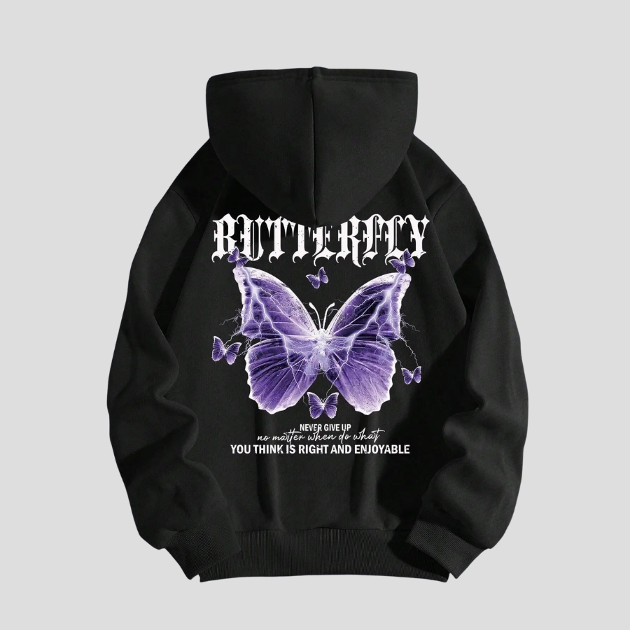 Černá punk mikina s fialovými motýly a nápisem