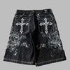 Černé džínové kraťasy Metal s kříži a stříbrnými ornamenty