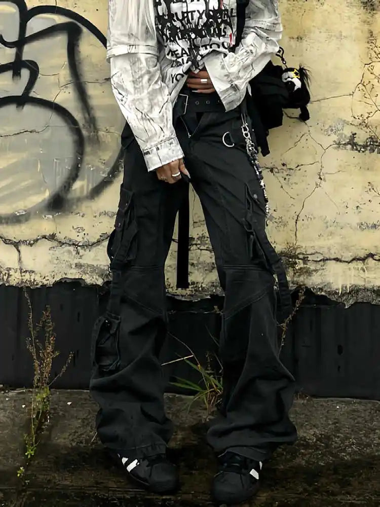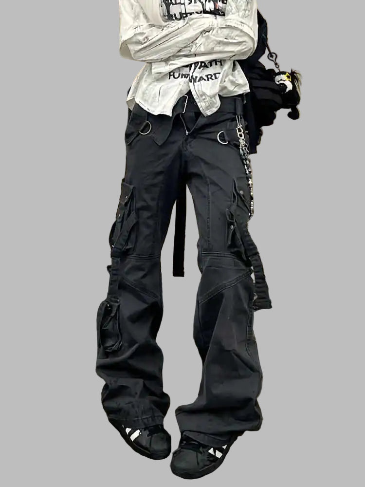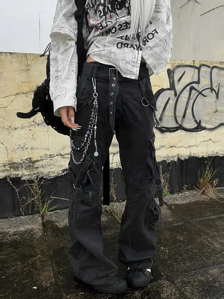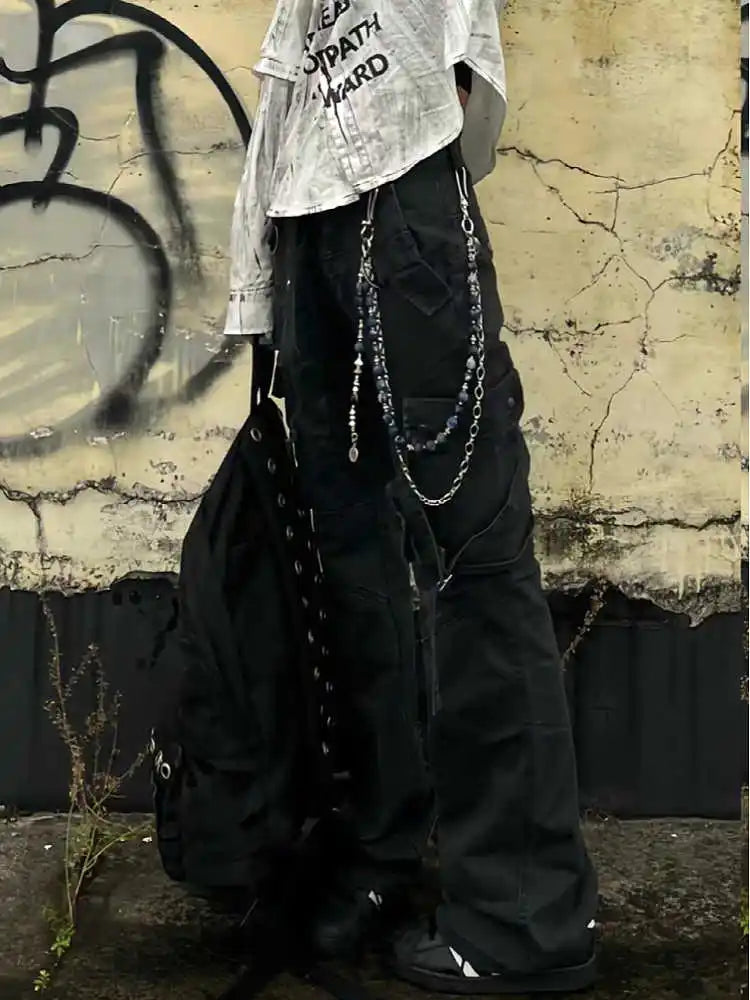 Černé gotické cargo kalhoty s řetězy a volnými kapsami unisex punkové