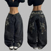 Černé punk rock kalhoty s rostlinnými výšivkami grunge