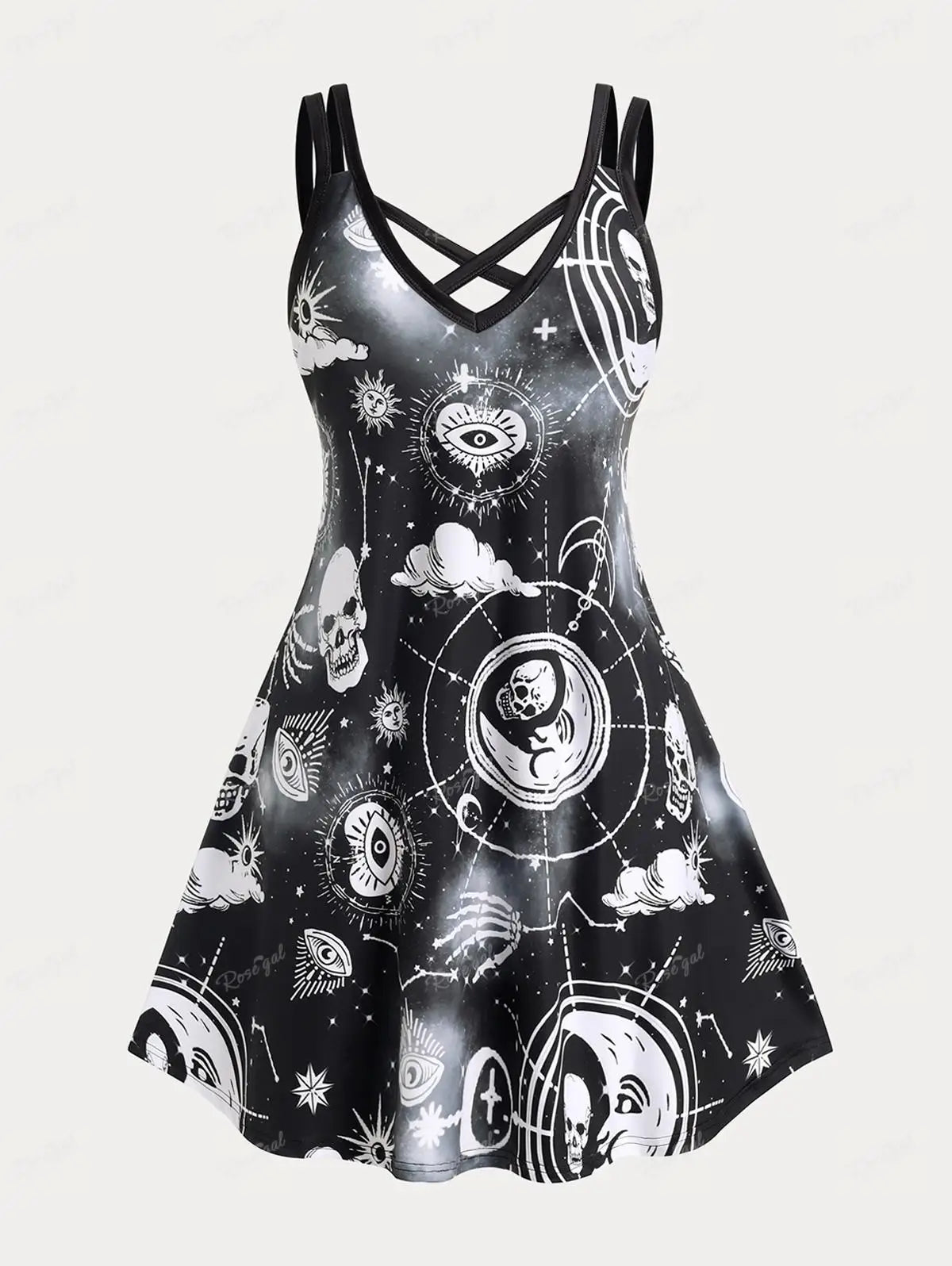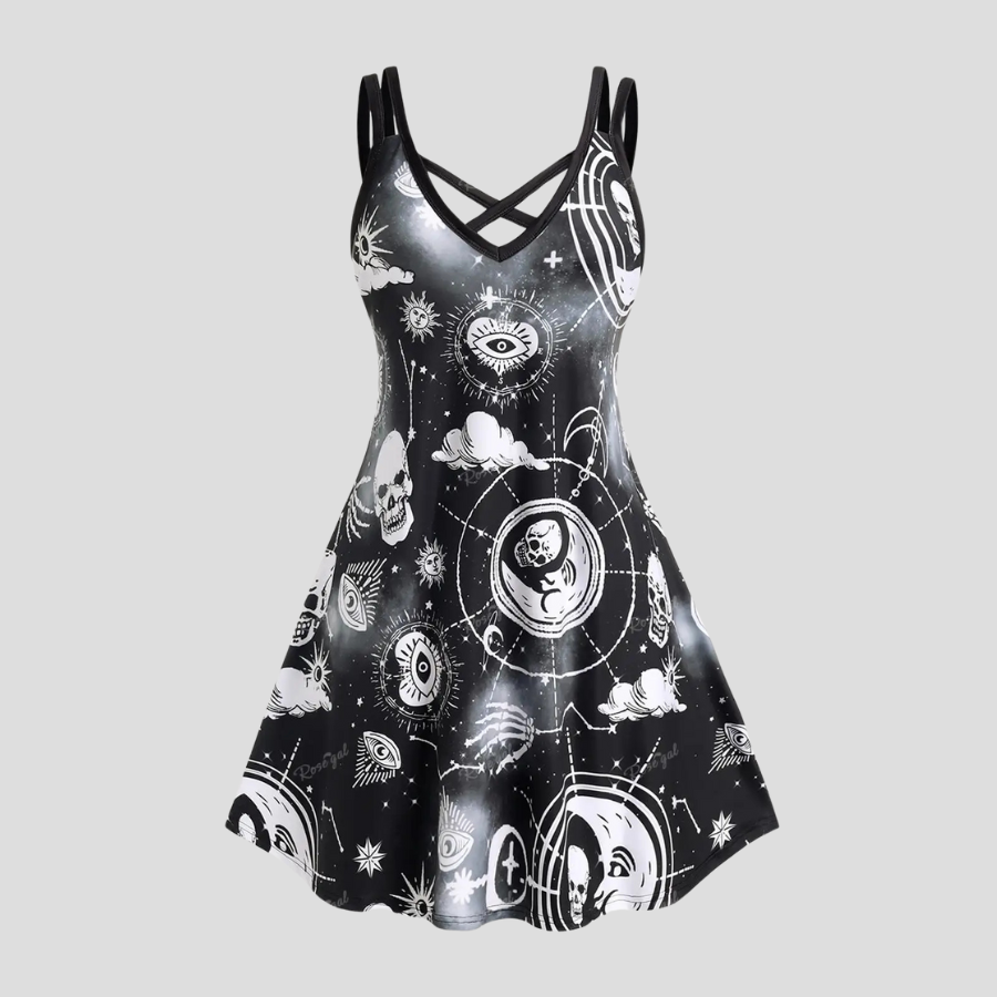 Černé Šaty Punk Rock s Okultními Symboly a Hvězdami