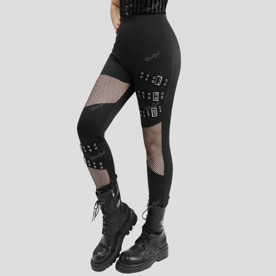 Punk Metal Legginsy z Siateczką i Klamrami Czarne