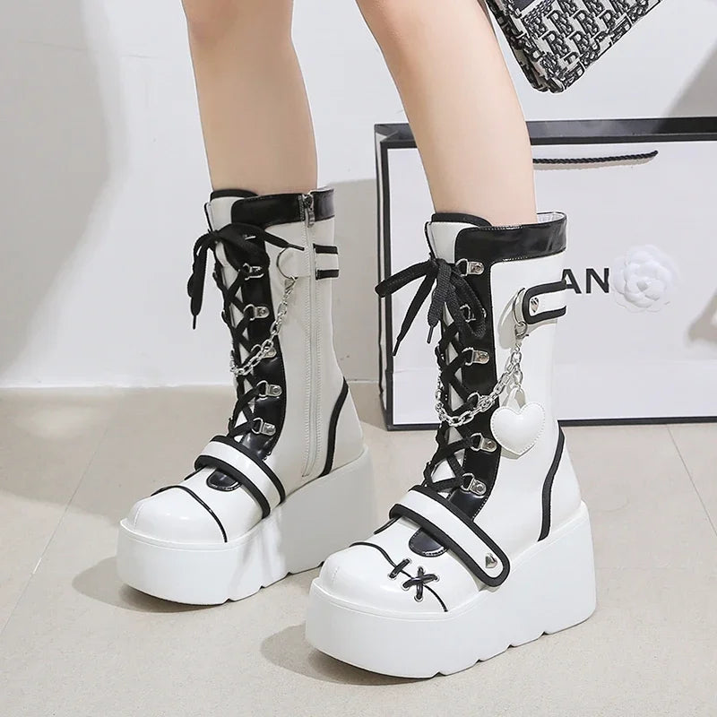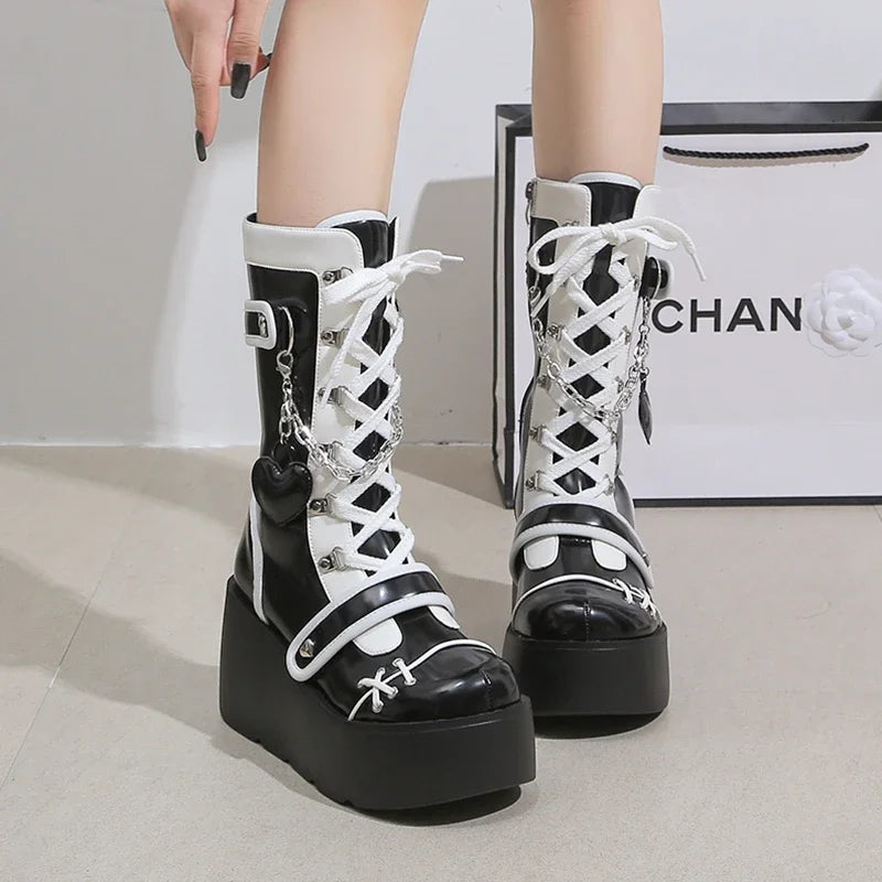 Černo-bílé gotické šněrovací boty na platformě