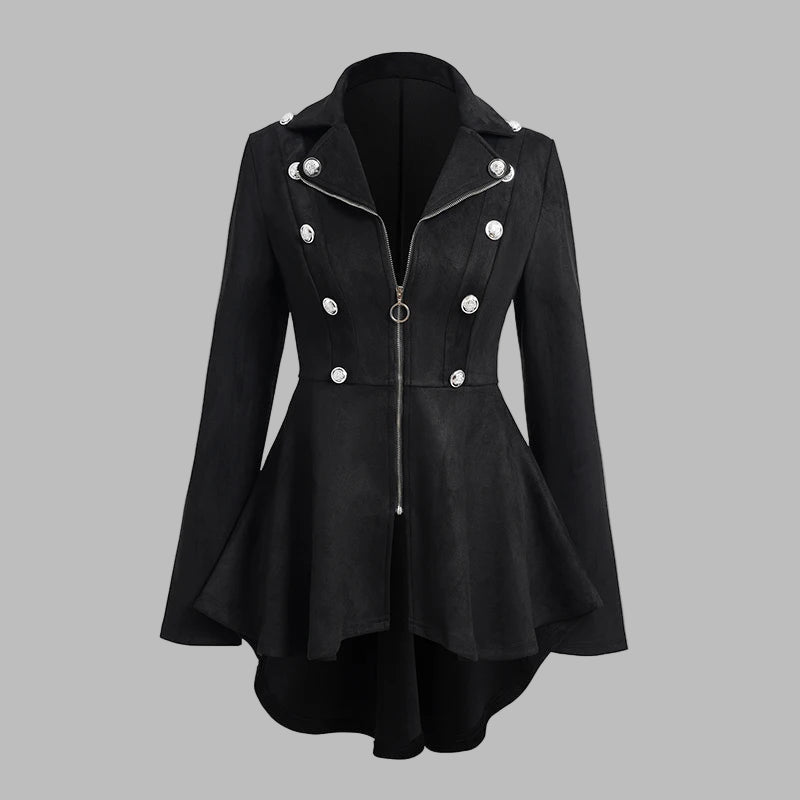 Dámský černý gotický kabát s rozšířeným střihem, knoflíky a zipem
