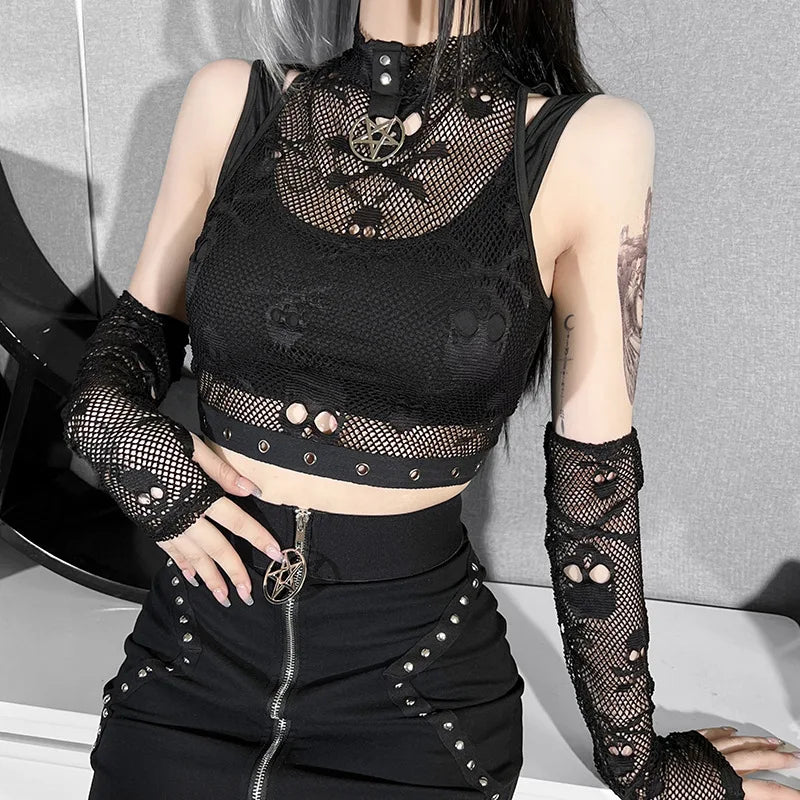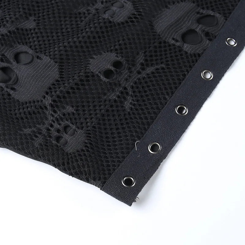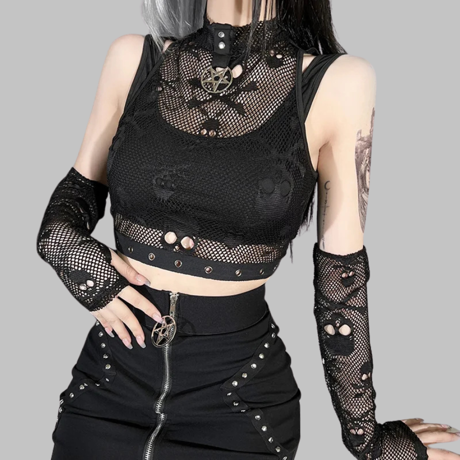 Černý gotický top ze síťoviny s potiskem lebky a filetovými rukávy
