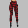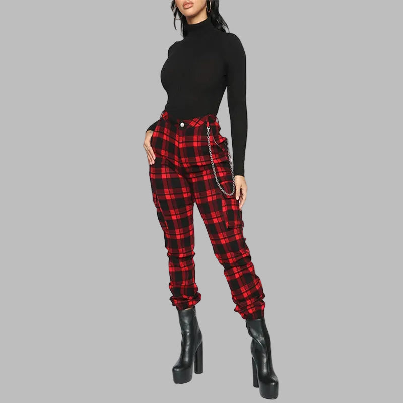Červené a černé kostkované punkové kalhoty s řetězem, přiléhavé