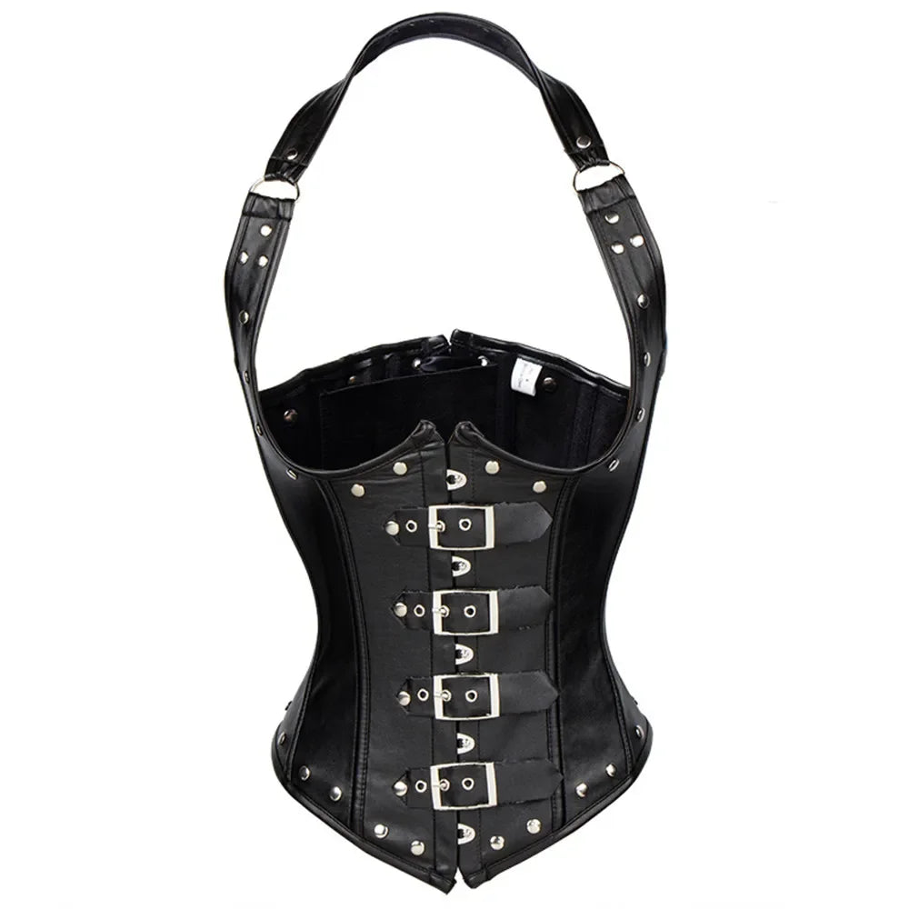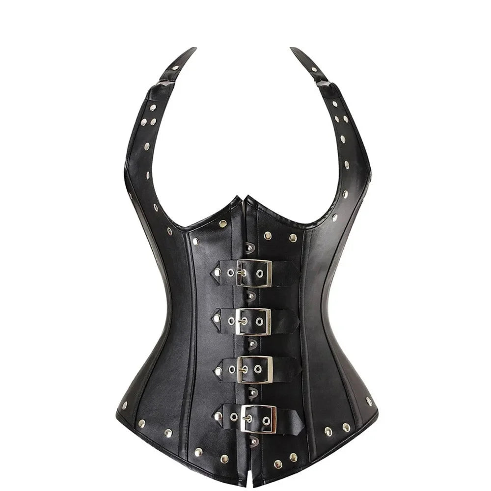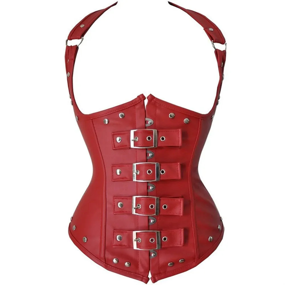 Červený korzet z eko kůže s přezkami – dámský punk rock styl