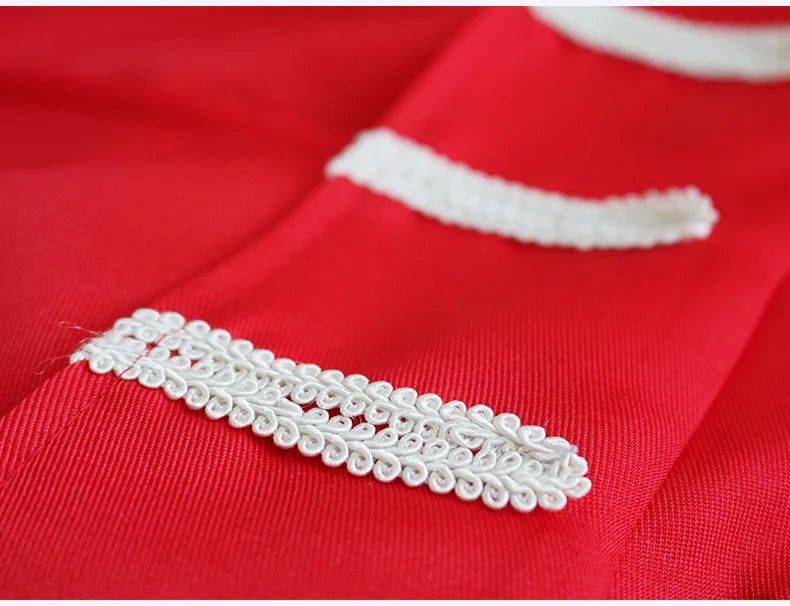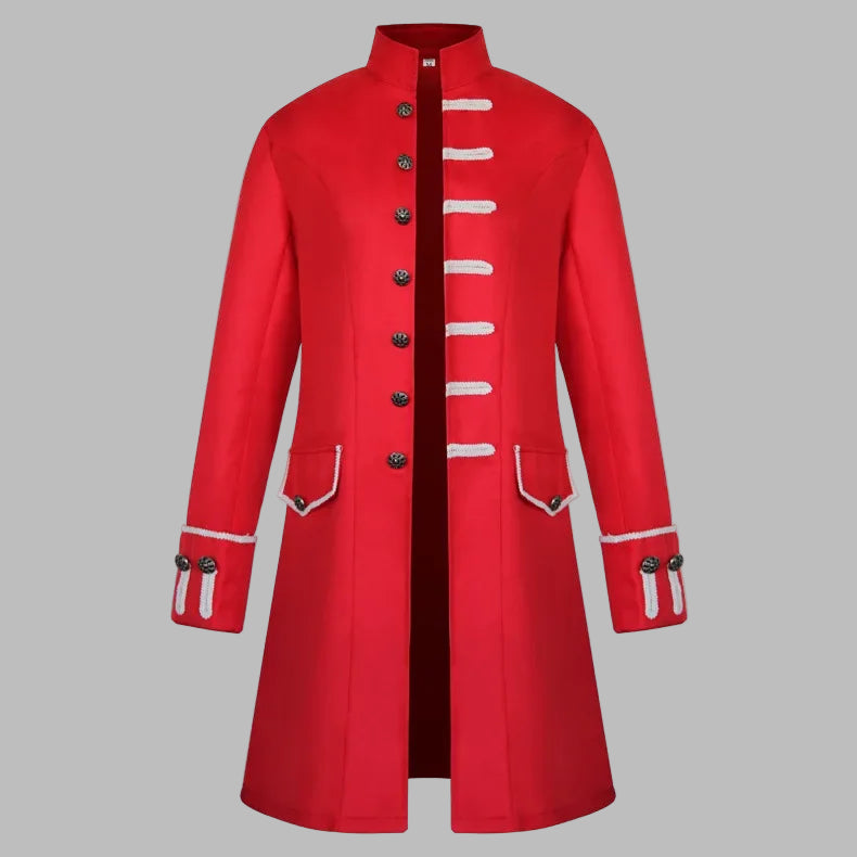Červený pánský steampunkový kabát s bílými ozdobnými šňůrami