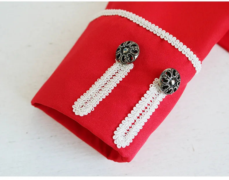 Červený pánský steampunkový kabát s bílými ozdobnými šňůrami Zobrazit moznosti