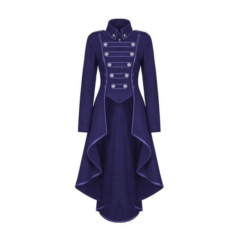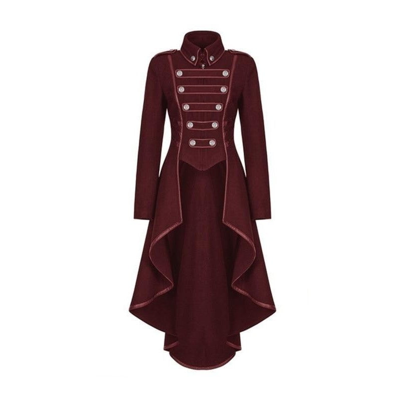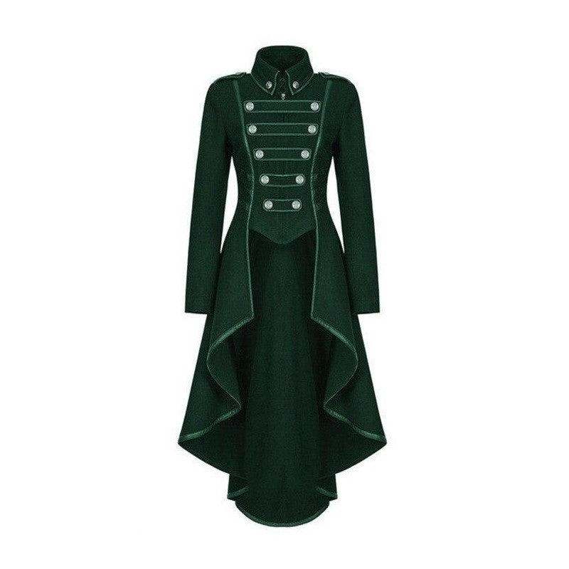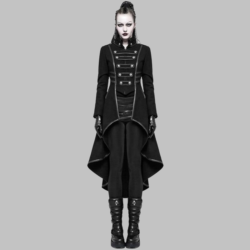 Objev dámský gotický kabát s dlouhým střihem. Zadní část kabátu má střih fraku.