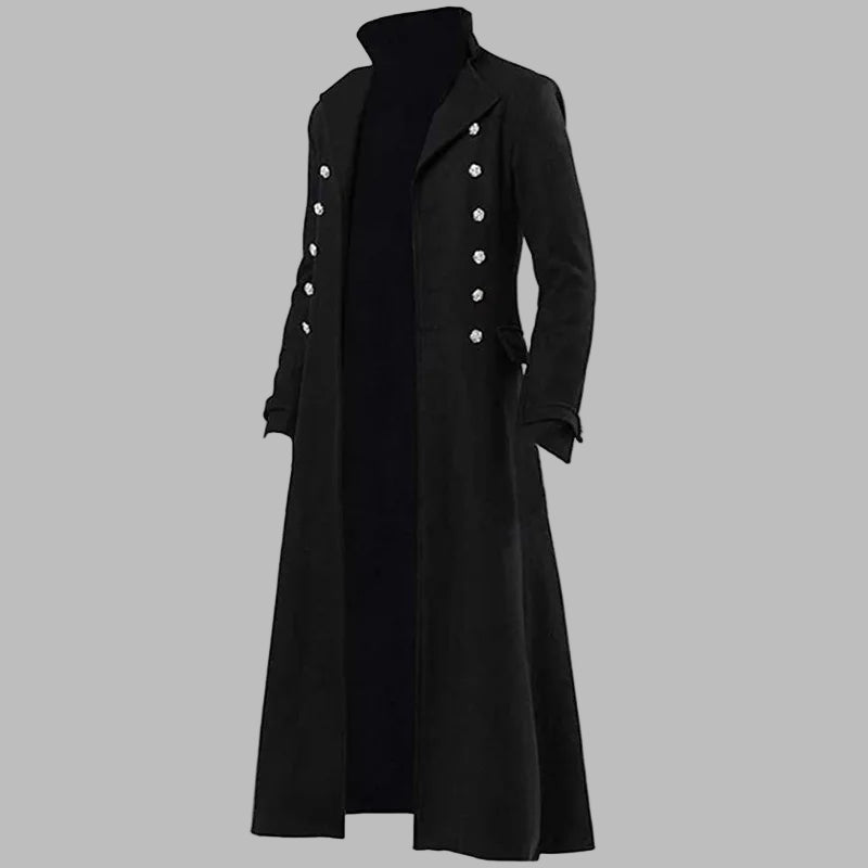 Dlouhý černý goth rock kabát s kovovými knoflíky elegantní