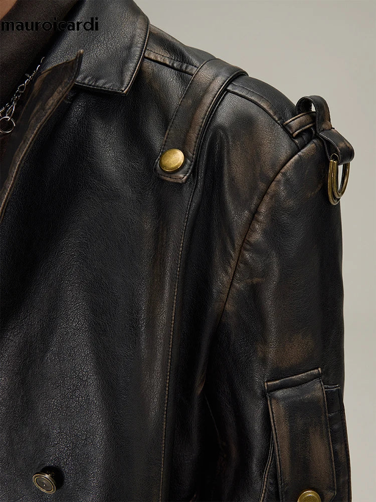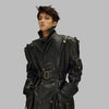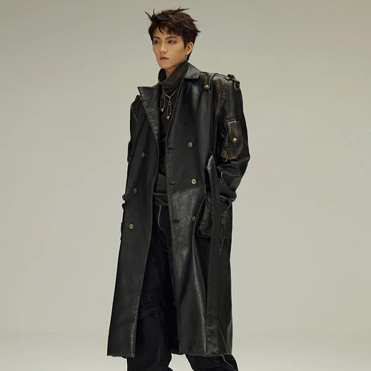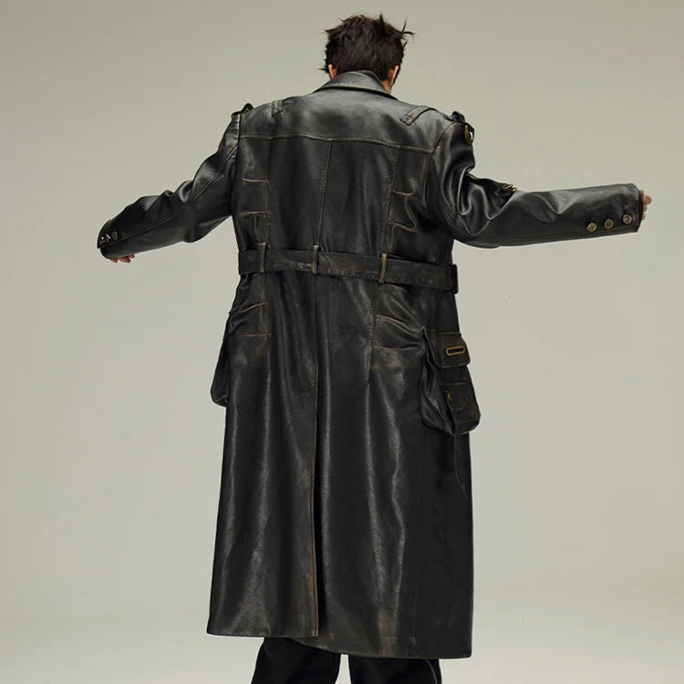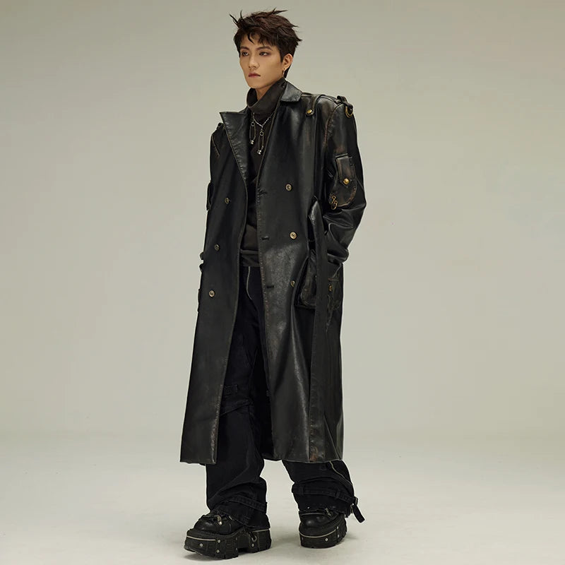 Dlouhý černý kožený kabát v gotickém alternativním stylu