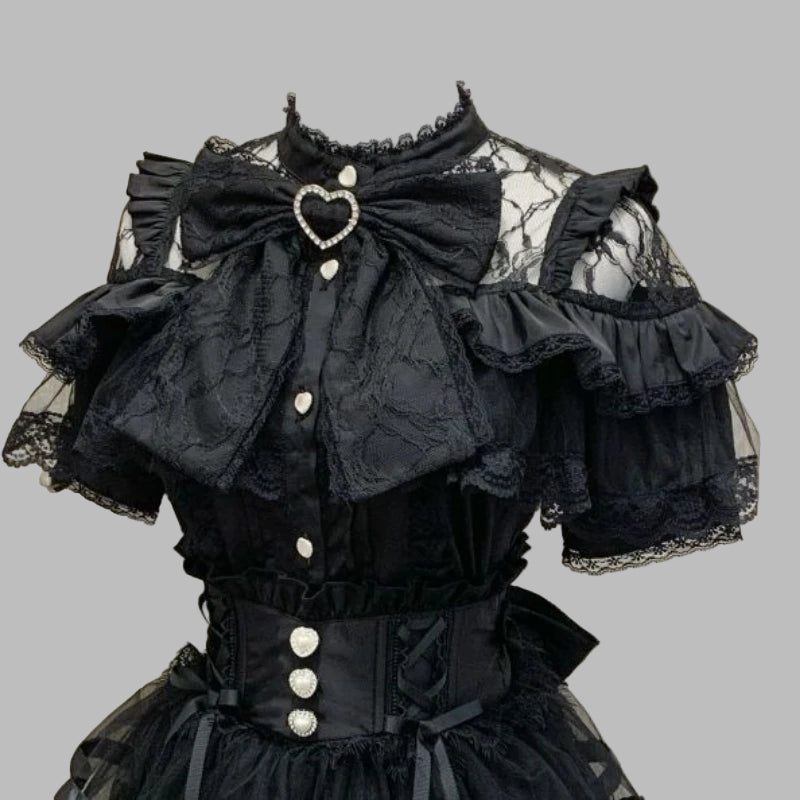 Černá gotická krajková halenka s mašlí a korzetovým páskem