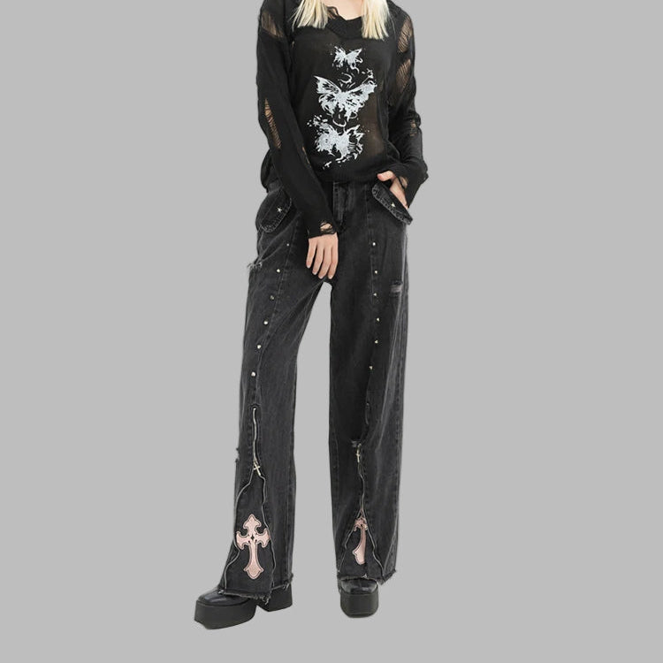 Gotické punkové džíny s kříži a cvočky, široké
