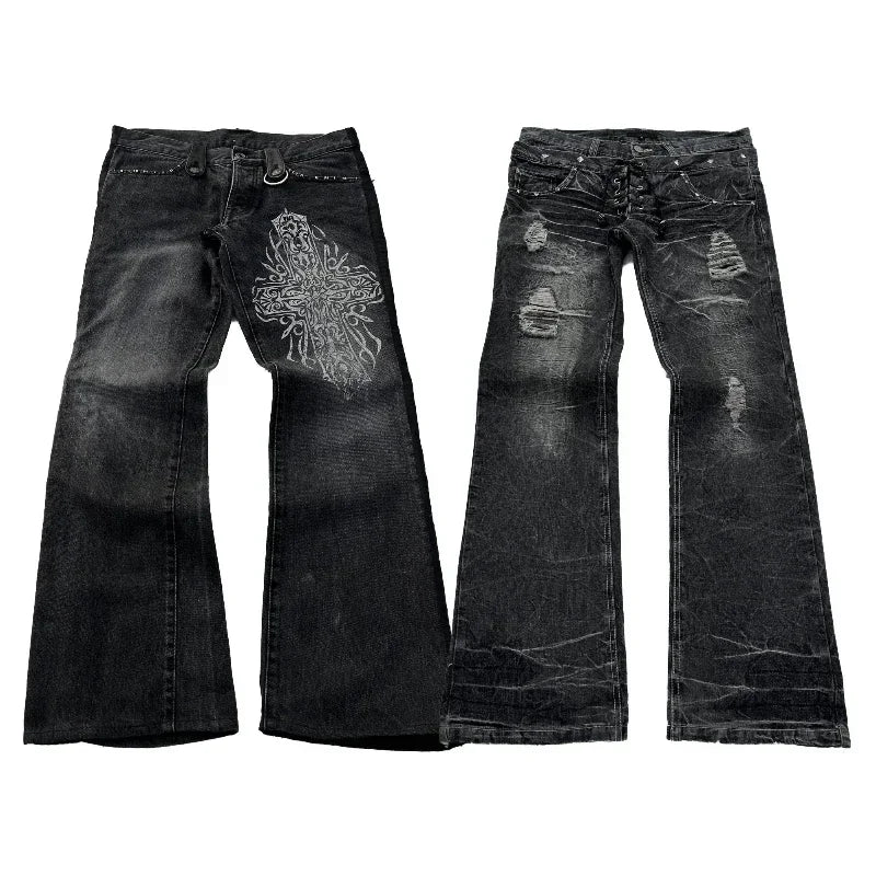 Grunge rozšířené džíny s oděrkami a gotickými výšivkami