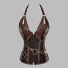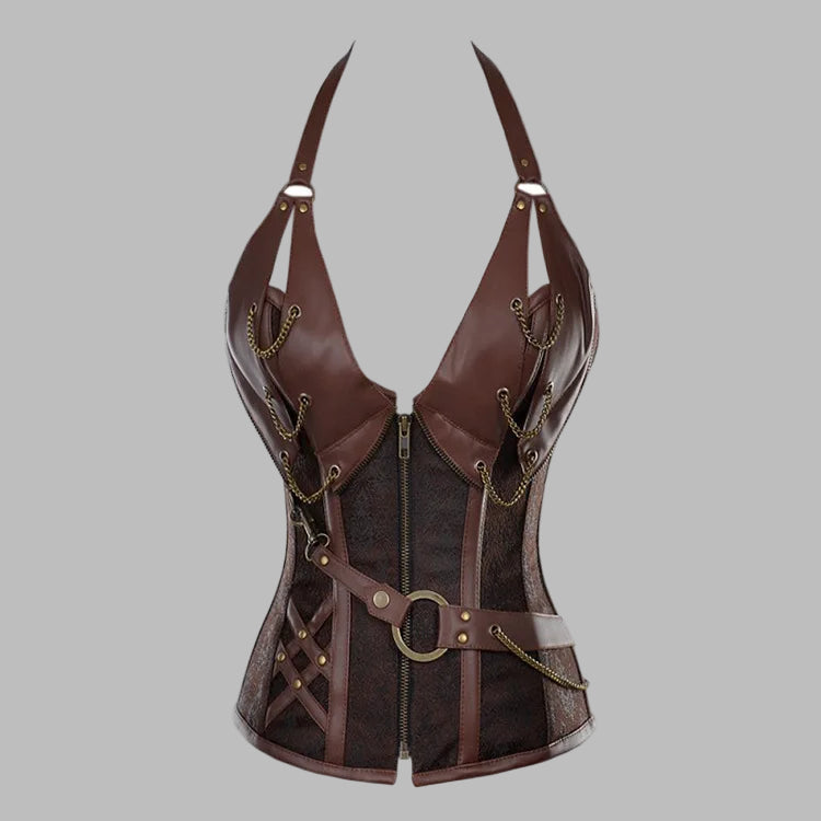 Hnědý steampunkový korzet s řetězy a koženými pásky