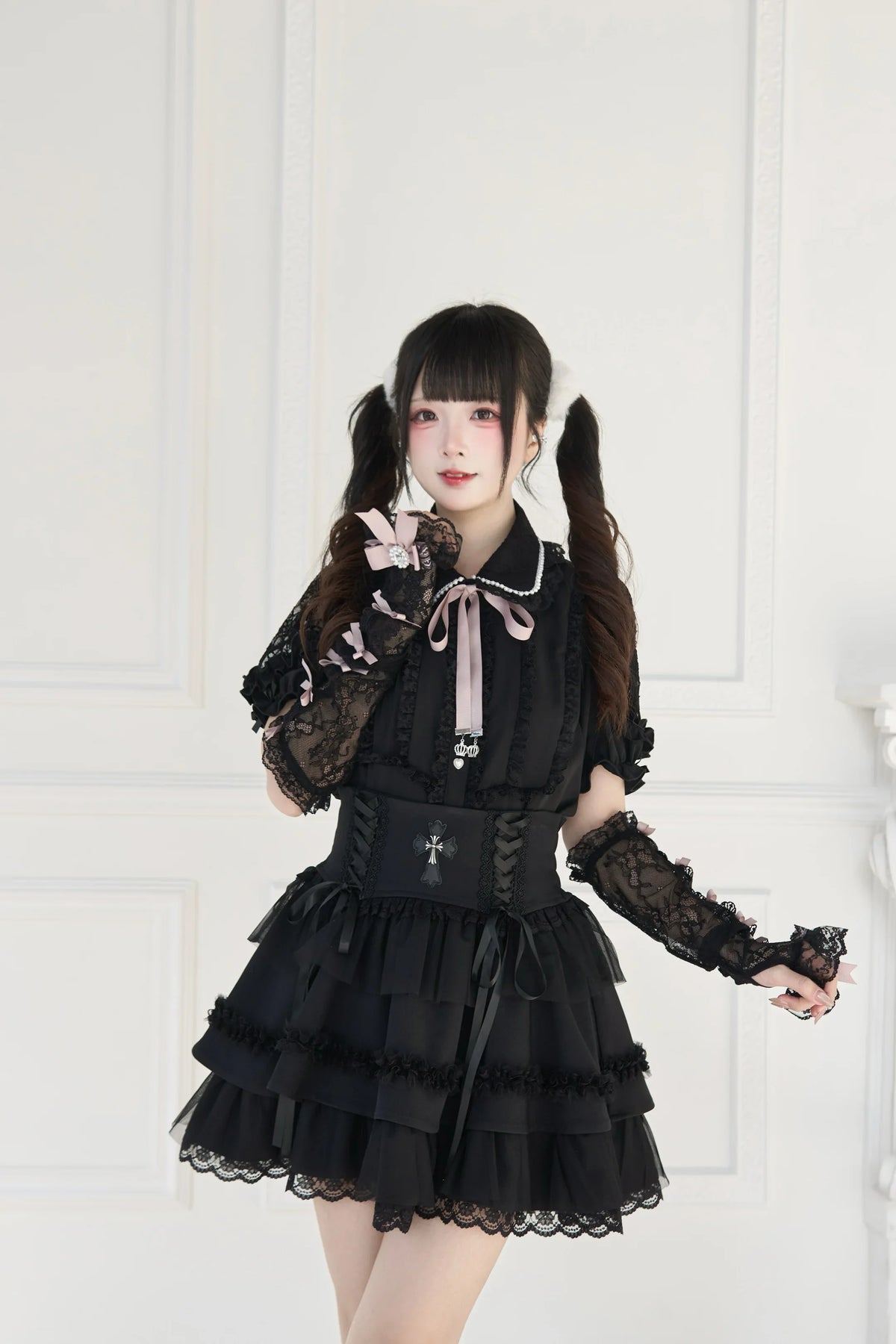 Jirai Kei černé punčochy s růžovými mašličkami Kawaii Lolita