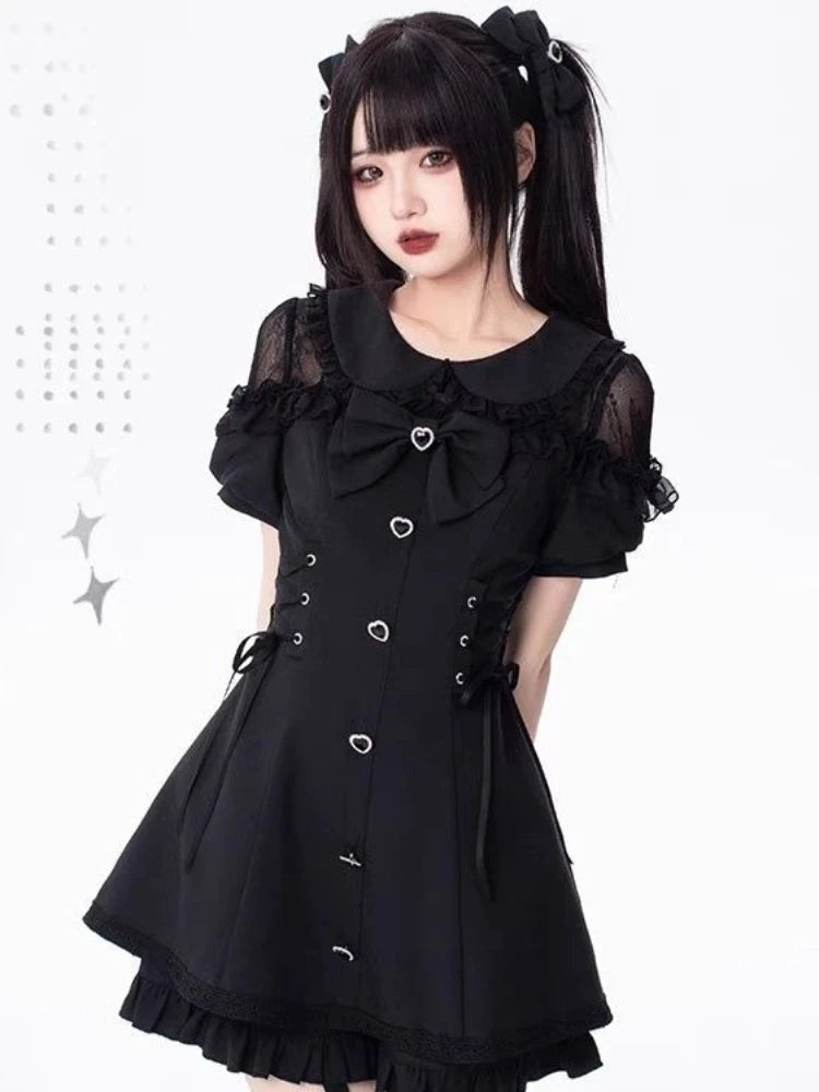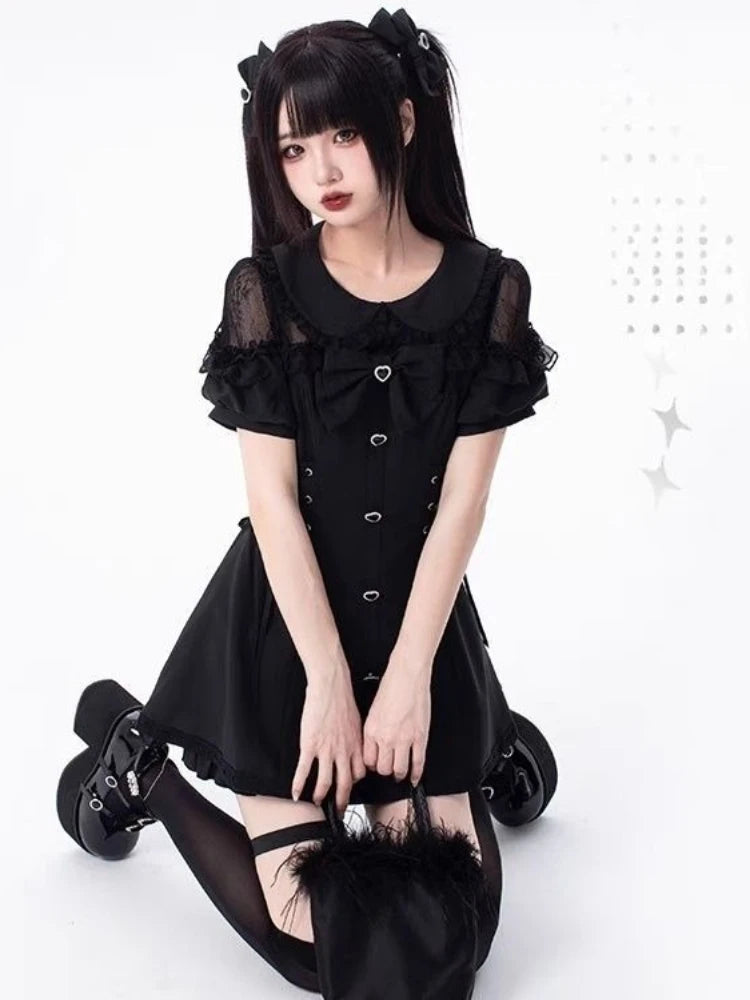 Jirai Kei Černé Šaty s Knoflíky ve Tvaru Srdce a Volánky