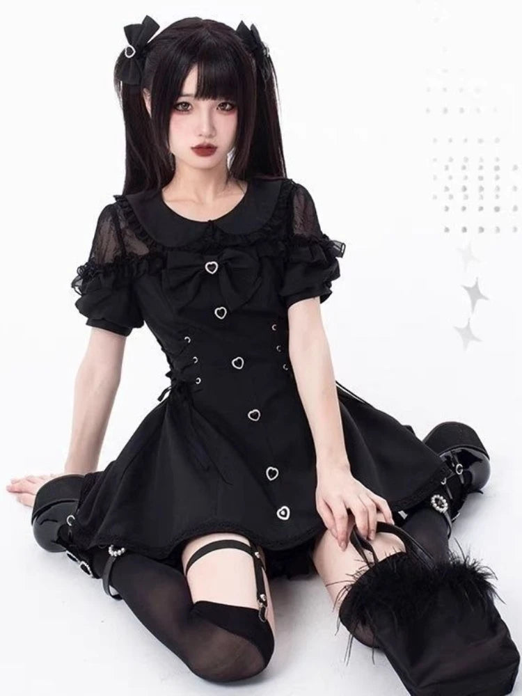 Jirai Kei Sukienka z Sercowymi Guzikami Czarna Falbankowa