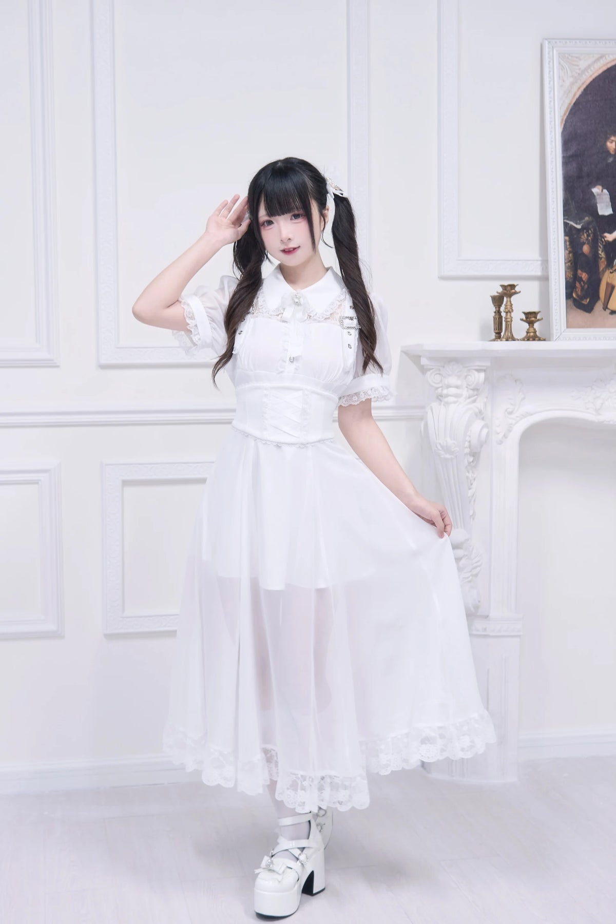 Jirai Kei Dlouhé Bílé Šaty s Volány Kawaii