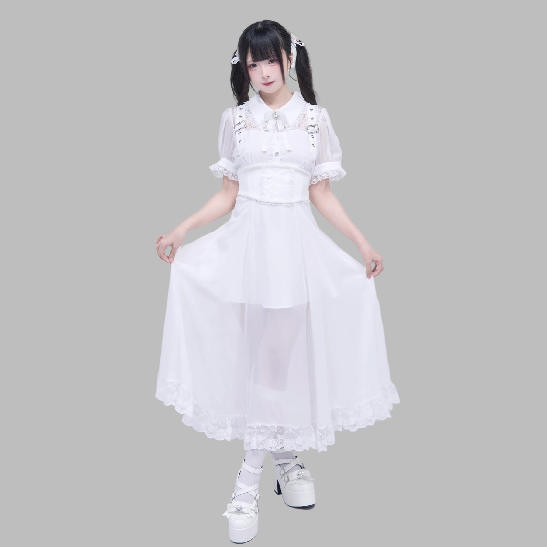 Dlouhé bílé šaty Jirai Kei s volánky Kawaii
