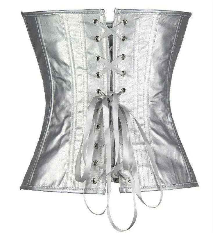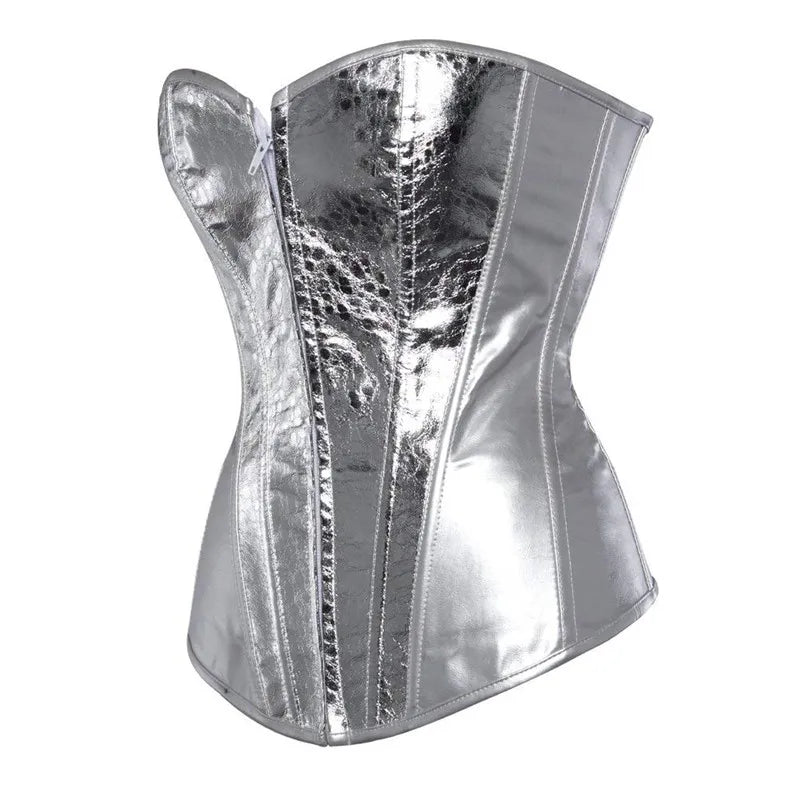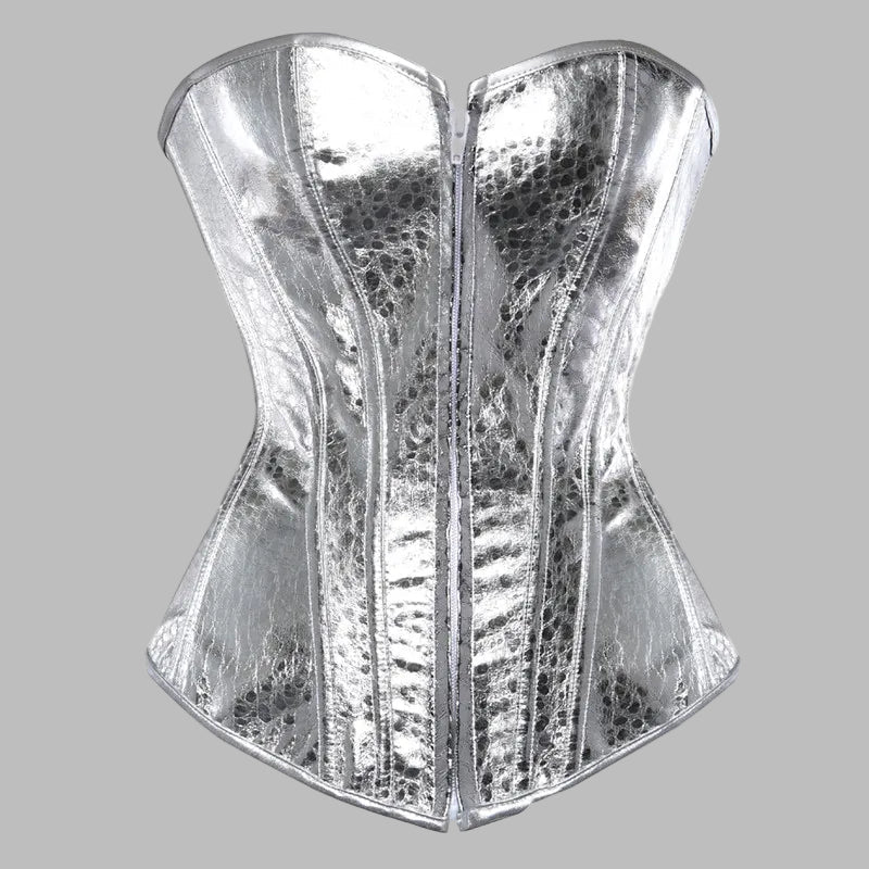 Stříbrný korzet s kovovým vzhledem a hadím vzorem s kosticemi