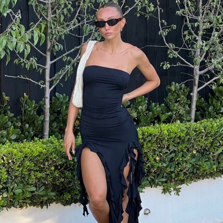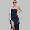 • Senzuální Detaily: Ovinutí přes prsa, výstřih bez ramínek a volány přidávají nádech smyslnosti a originality těmto šatům, vytvářejíc harmonickou rovnováhu mezi sváděním a elegancí.