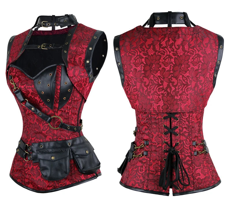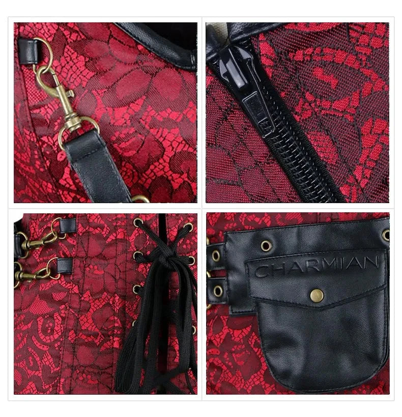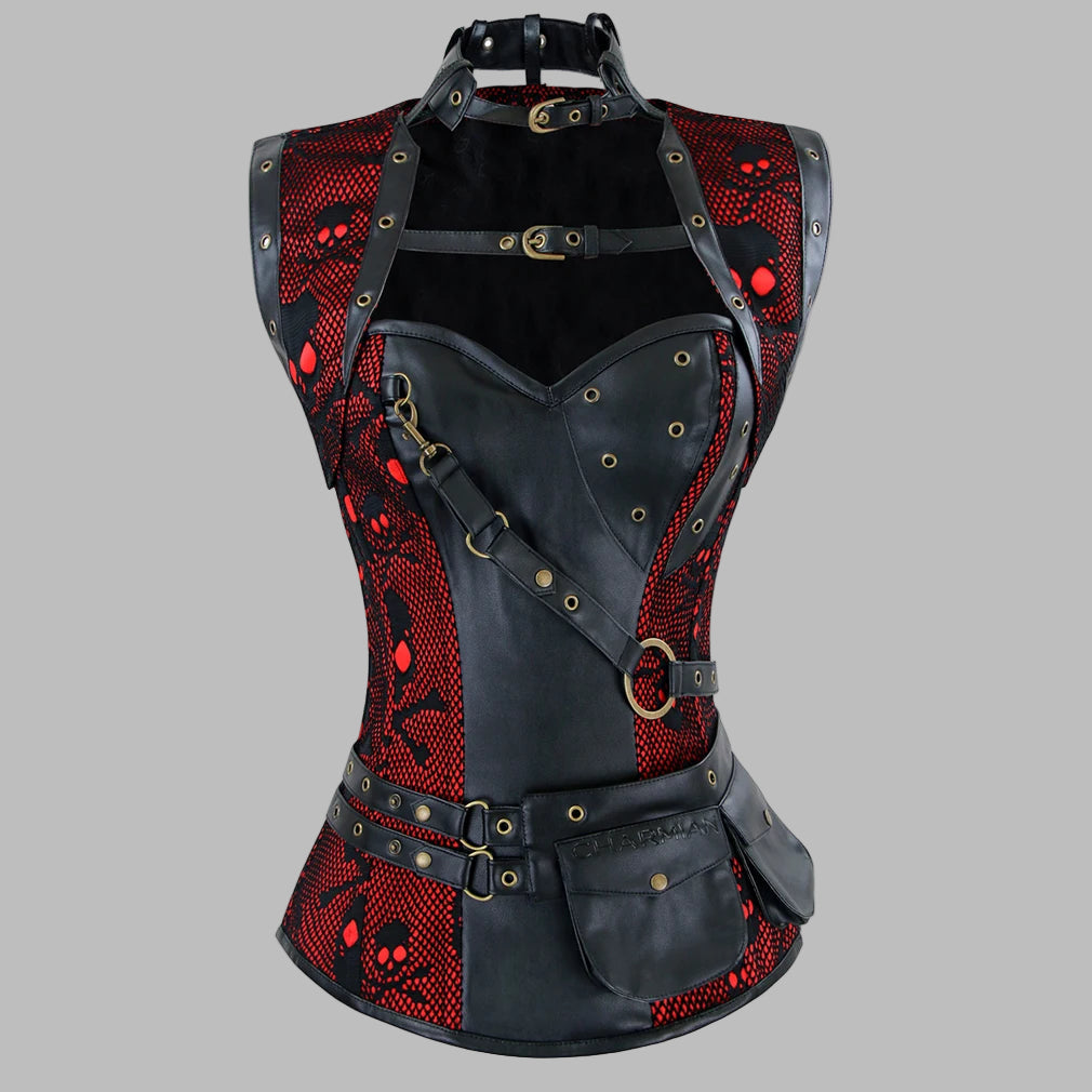Punk korzet s červenou síťovinou a černými lebkami