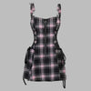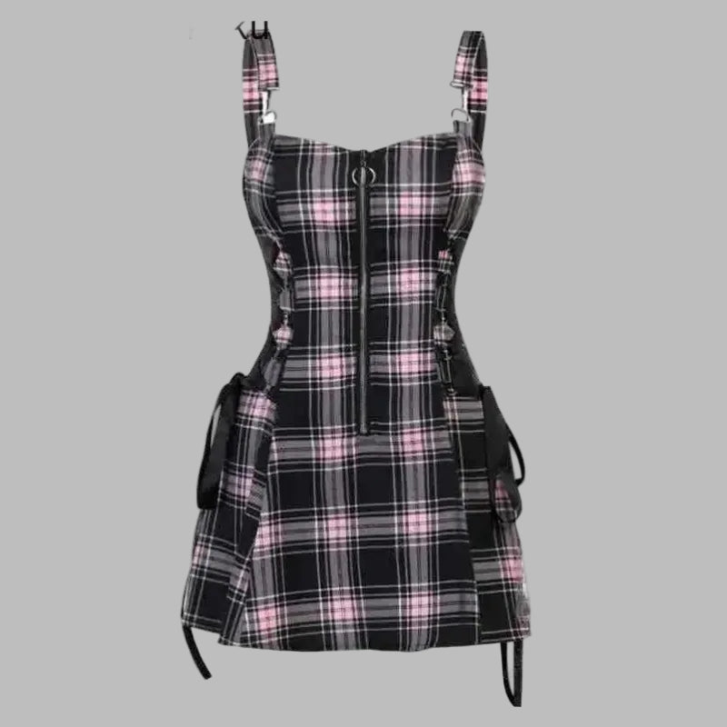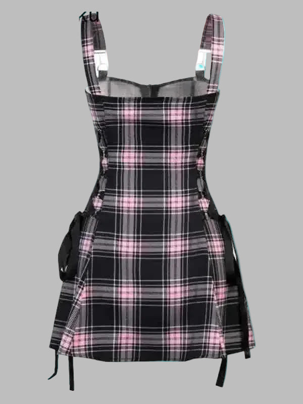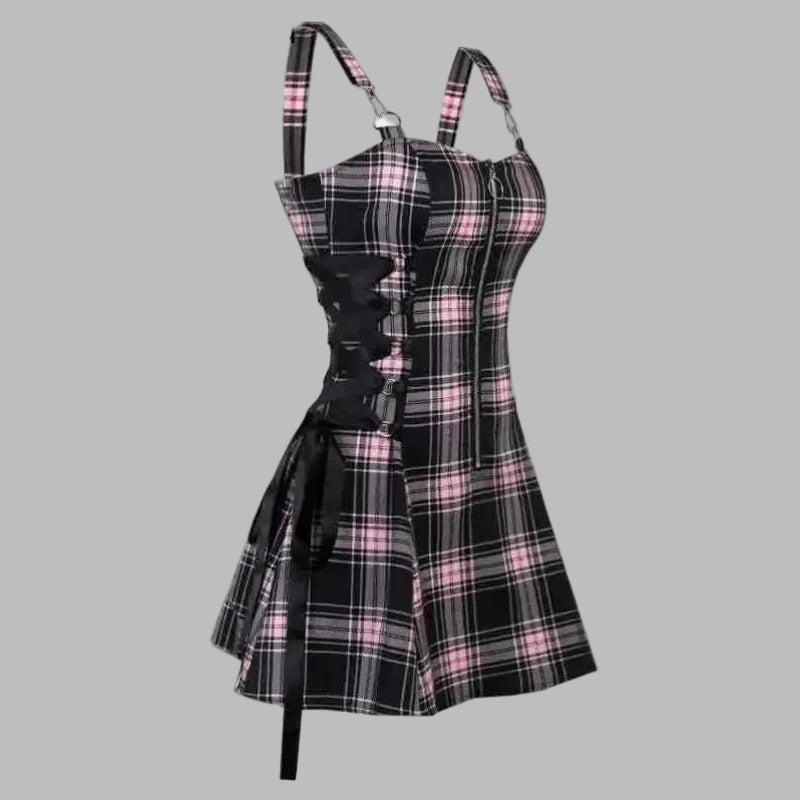 Punk růžové kostkované šaty s kšandami a pásky