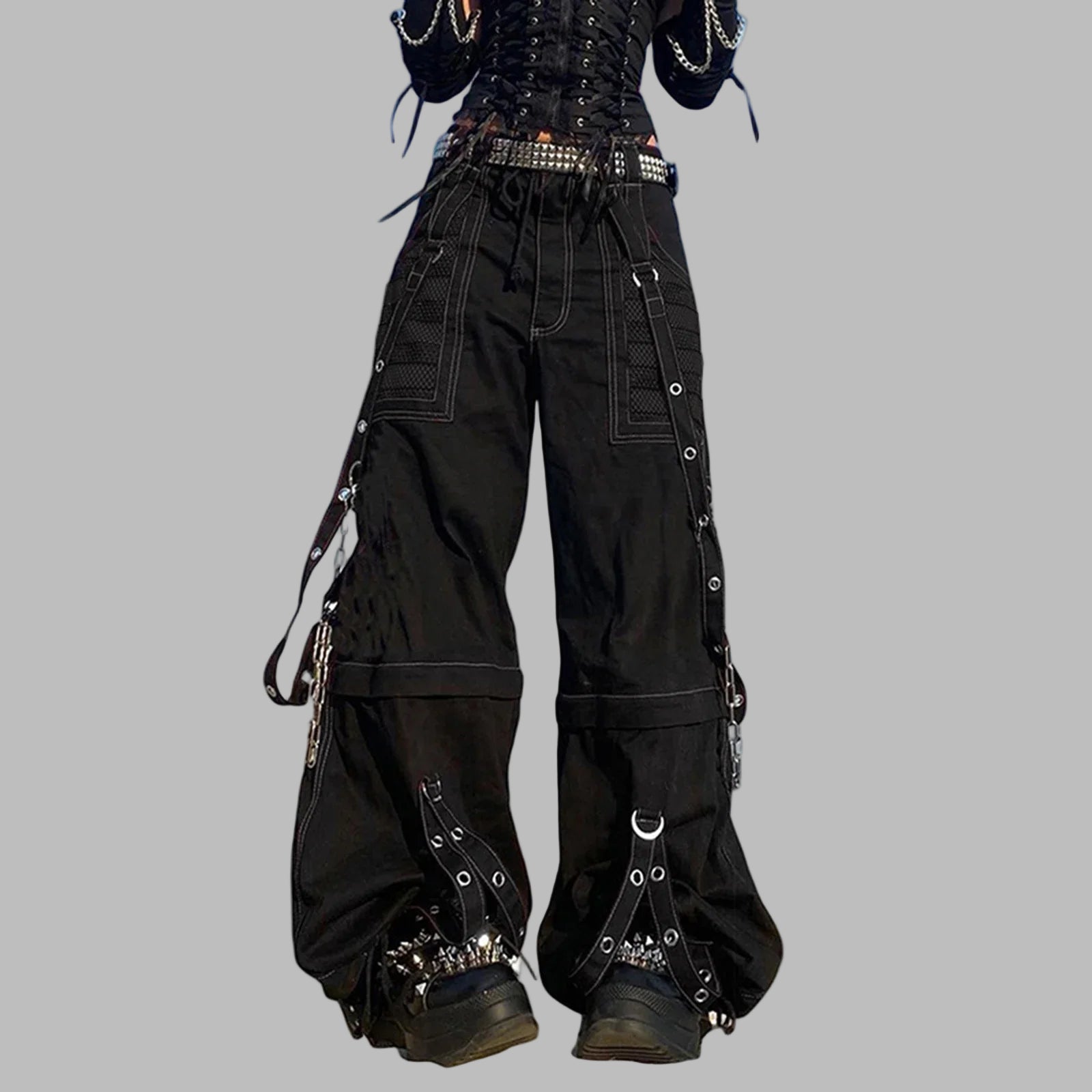 Černé punk metal cargo kalhoty s řetězy a cvočky