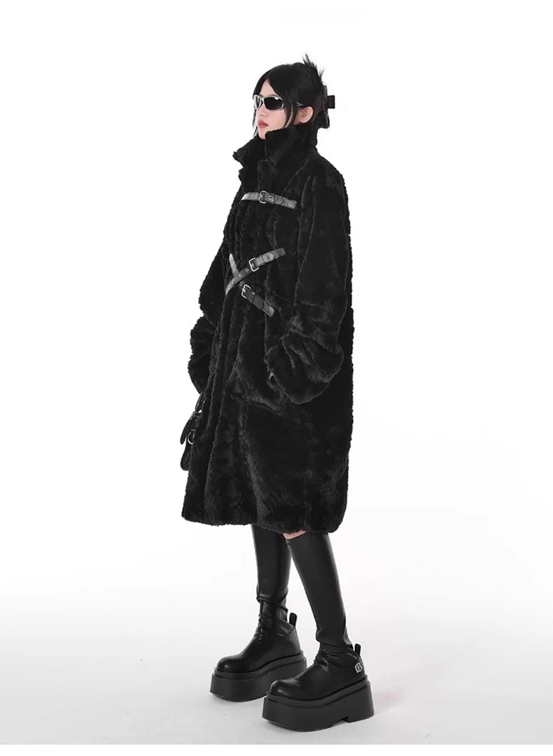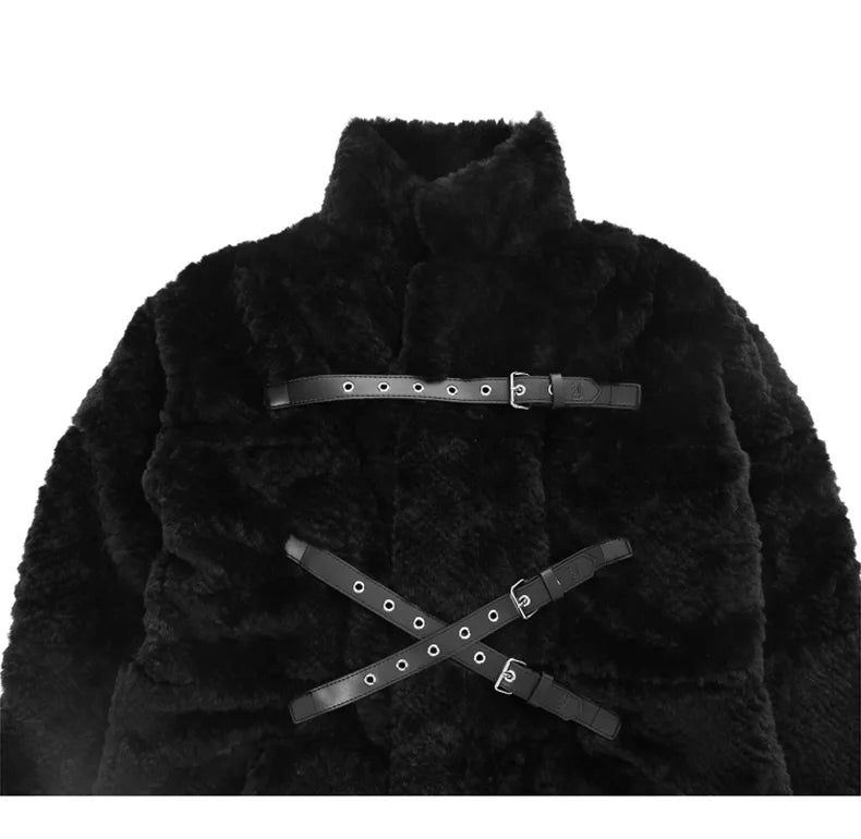 Punkový černý kabát s pásky a dlouhým kožíškem