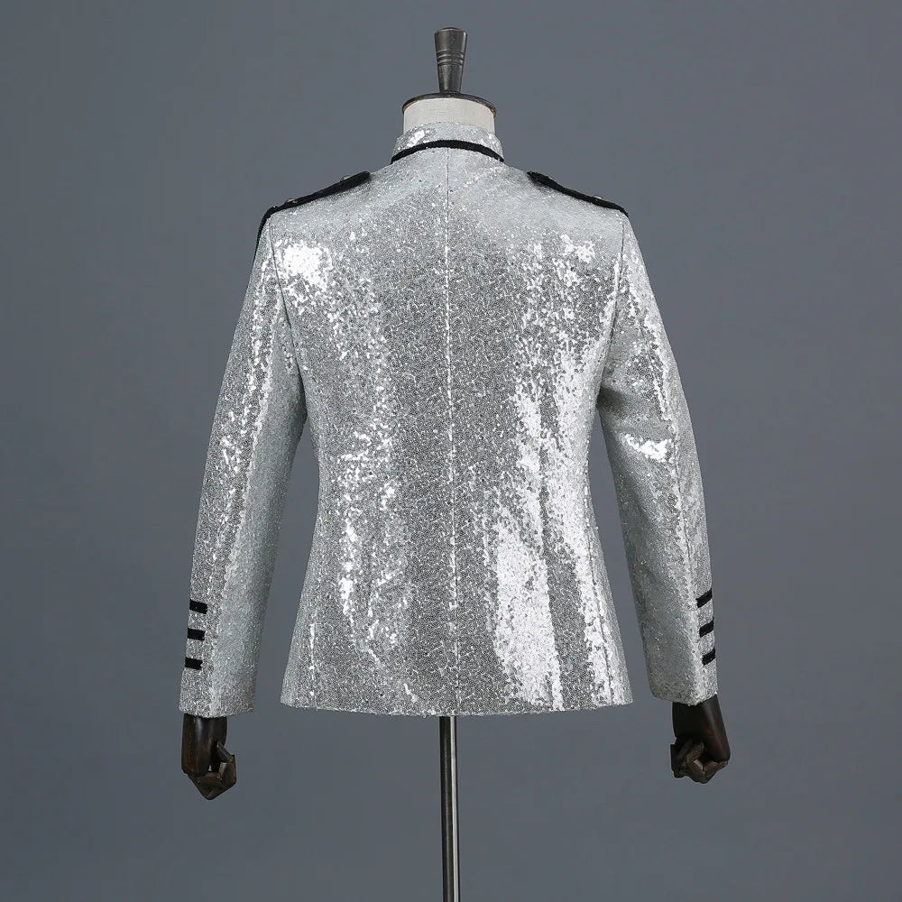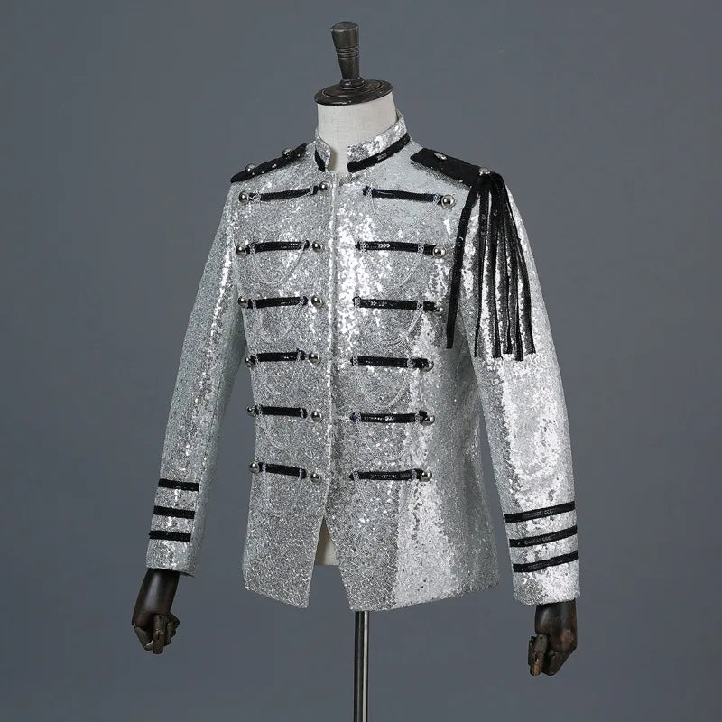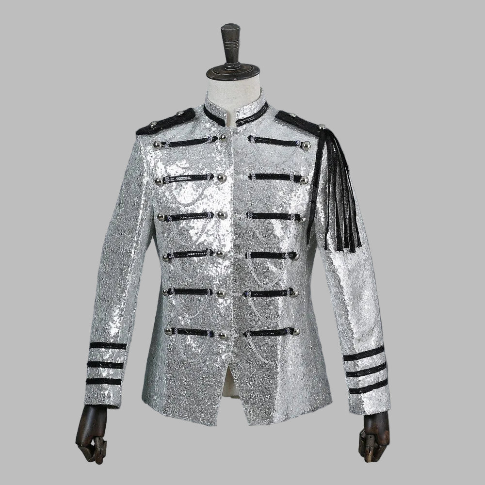 Rocková stříbrná sako s černými třásněmi vojenský styl s flitry